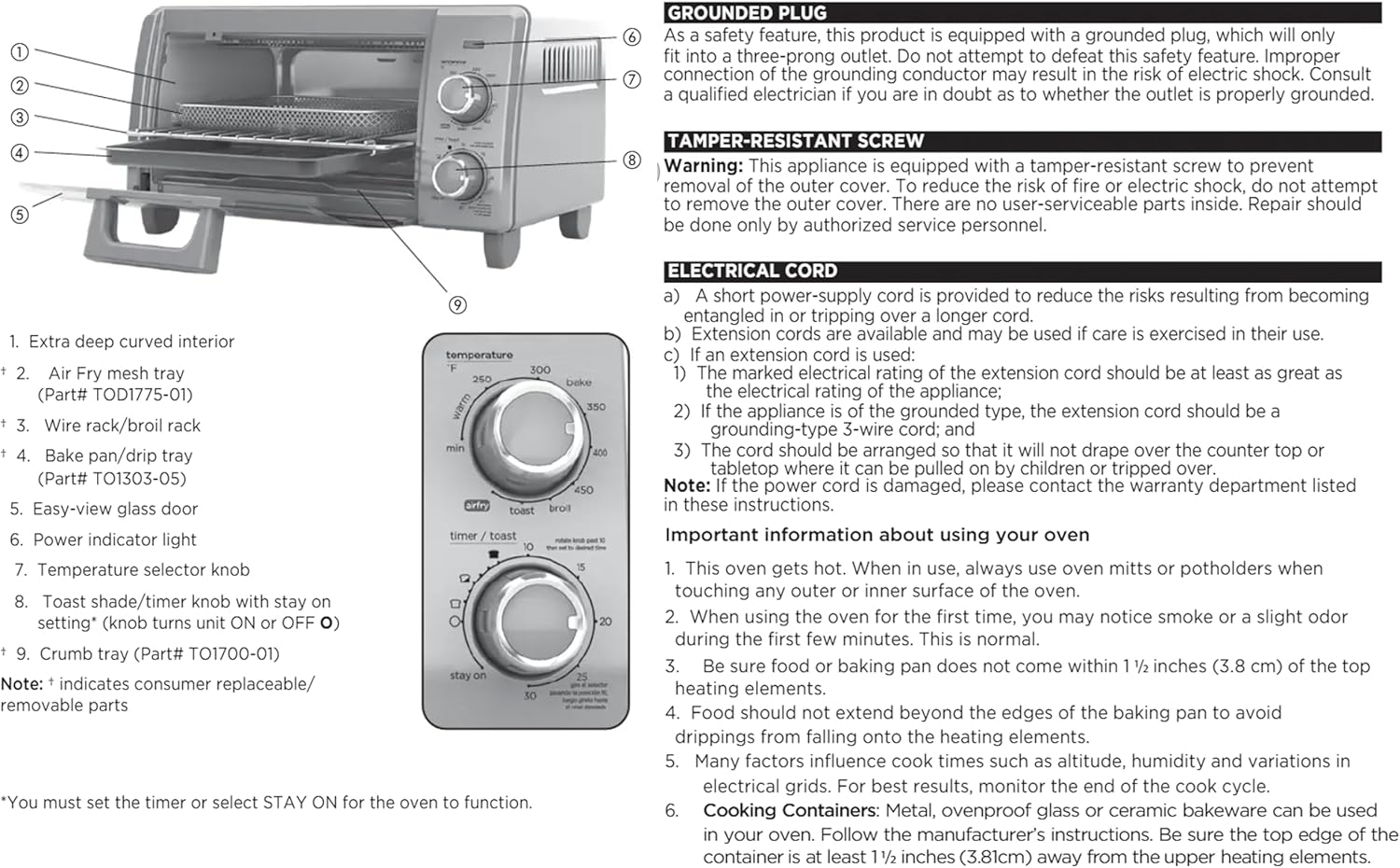 - USER-FRIENDLY CONTROLS & 7 ACCESSORIES – 30-minute timer with removable crumb/drip tray, bake pan, air fry mesh tray, and wire rack for easy cleanup. Use drip tray when cooking and keep food clear of heating element. See User Manual for proper use.