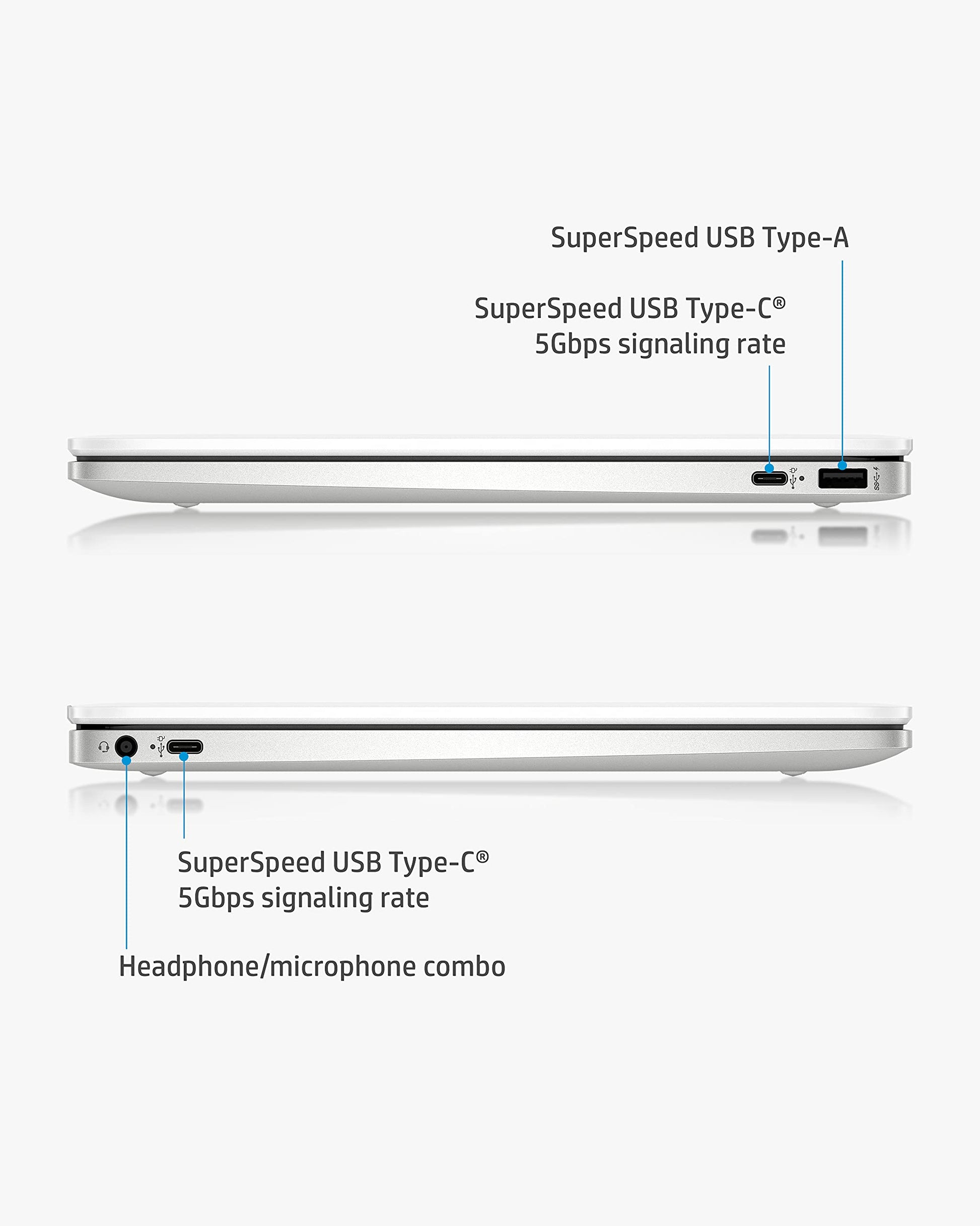 The HP Chromebook empowers you to work more efficiently from the comfort of your own home. The 14” HD (1366 x 768) micro-edge, anti-glare (1) display makes images appear crisp. With Intel® Celeron® N4000 (2) processing power and Intel® UHD Graphics 600 (3), binge watching, gaming, and music are taken to new heights. Securely storing and quickly accessing your work is a breeze with 32 GB eMMC storage (4) and 4 GB of RAM. Work and entertainment doesn’t have to end with up to 13 hours and 30 minutes of streaming power (5) with mixed usage. The Chrome operating system lets you effortlessly navigate through tabs and programs. Your Chromebook is protected with HP’s 1-year limited hardware warranty. Easily communicate with colleagues and friends with the HP Wide Vision HD camera (6) with integrated dual array digital microphones. The Wi-Fi® 5 (2x2) and Bluetooth® 5.0 combo (7) keeps your connection clear so you can continue to work with efficiency. This lightweight computer is 3.24lbs (8), allowing you to easily store it in your Chromebook case for on-the-go use. Reduce your carbon footprint by working with HP ENERGY STAR® certified (9) and EPEAT® Silver registered (10) computers. (1) High-definition (HD) content is required to view high definition images. (2) Multi-core is designed to improve performance of certain software products. Not all customers or software applications will necessarily benefit from use of this technology. Performance and clock frequency will vary depending on application workload and your hardware and software configurations. Intel’s numbering, branding and/or naming is not a measurement of higher performance. Intel, Pentium, Intel Core, Celeron, Iris Xe, Intel logo and the Intel Inside logo are trademarks of Intel Corporation in the U.S. and other countries. (3) Shared video memory (UMA) uses part of the total system memory for video performance. System memory dedicated to video performance is not available for other use by other programs. (4) For storage drives, GB = 1 billion bytes. Actual formatted capacity is less. Portion of internal system storage is reserved and not user accessible. (5) Testing conducted by HP using Google Chrome OS power LoadTest. Battery life will vary and the maximum capacity of the battery will naturally decrease with time and usage. See chromium.org/chromium-os/testing/power-testing for test details. (6) Features may require software or other 3rd party applications to provide the described functionality. Internet service required and not included. (7) Wireless access point and internet service required and sold separately. Availability of public wireless access points limited. Wi-Fi 5 (802.11ac) is backwards compatible with prior Wi-Fi 5 specs. Bluetooth® is a trademark owned by its proprietor and used by Hewlett-Packard Company under license. (8) Weight and system dimensions may fluctuate due to configuration and manufacturing variances. (9) ENERGY STAR and the ENERGY STAR mark are registered trademarks owned by the U.S. Environmental Protection Agency. (10) Based on U.S. EPEAT® registration according to IEEE 1680.1-2018 EPEAT®. EPEAT® status varies by country. Visit www.epeat.net for more information. High-definition (HD) content is required to view high definition images.
